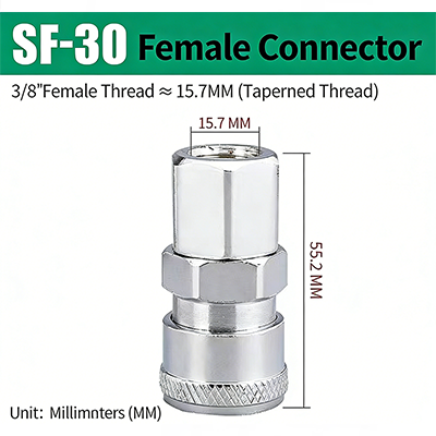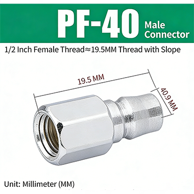 تحتوي الوصلات السريعة من النوع C من سلسلة PF–SF مع JIS PT Thread على بنية توصيل سريع من النوع C. يمكن مطابقة رؤوس الذكور والإناث حسب الرغبة، ويمكن توصيلها وتوصيلها، وهو أمر مريح للغاية. يعتمد المفصل معالجة الطلاء الكهربائي السطحي، مع قلب نحاسي داخلي، وهو ليس فقط مقاوم للتآكل، ولكن أيضًا مقاوم للتآكل، مما يحسن متانة المفصل ويطيل عمر الخدمة.