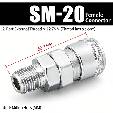 1. إس إم-20. موصل ذكر 1/2 بوصة، قطر الخيط 20.5 مم، والطول الإجمالي 43.7 مم.