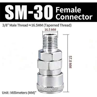 2. إس إم-30. الخيط الذكوري مقاس 3/8 بوصة عبارة عن هيكل خيط خارجي مخروطي يبلغ قطر الخيط 16.5 مم وطول إجمالي 57.8 مم.
